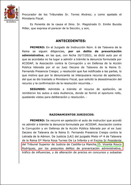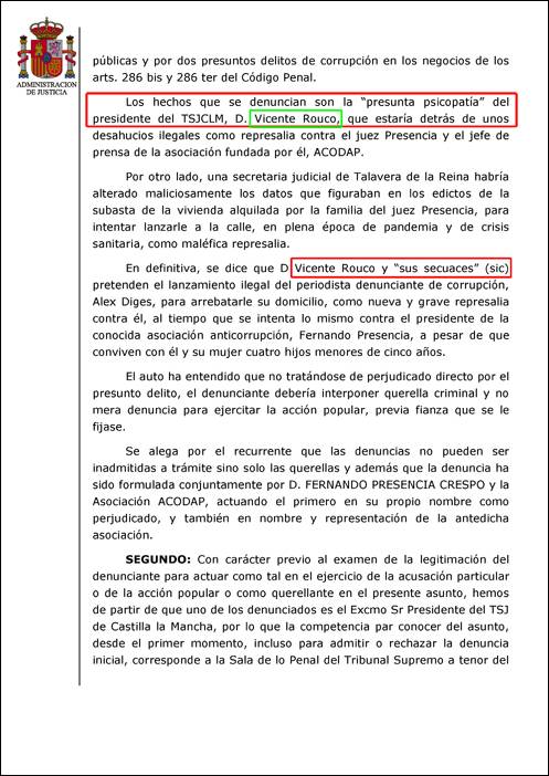 Deja patente el texto de la resolución que los jueces de Toledo conocen tal circunstancia: “Los hechos que se denuncian son la ‘presunta psicopatía’ del presidente del TSJCLM, D.Vicente Rouco, que estaría detrás de unos desahucios ilegales como represalia contra el juez Presencia y el jefe de prensa de la asociación fundada por él, ACODAP.”