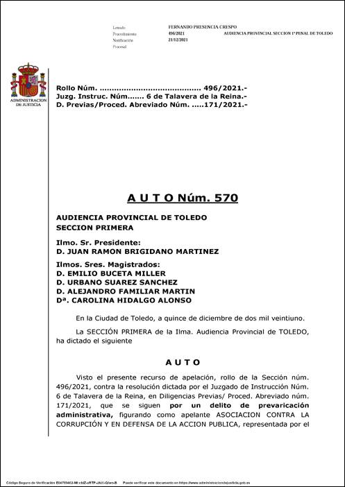 La sección primera de la Audiencia, presidida por Juan Ramón Brigidano Martínez, lo deja bien claro haciéndose eco, mediante su Auto nº 570, de los desequilibrios que llevan al presidente del TSJCLM (cuyo cargo okupado caducó en diciembre de 2020) a cometer un incontable cúmulo de anomalías.